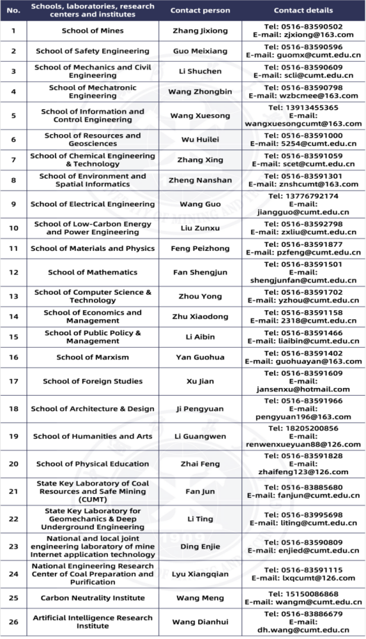 Candidates must age 38 and below (43 and below for those in Philosophy, Social sciences, Art and Culture) and be able to work on a full-time basis at CUMT. Candidates must be promising and backbone talents who have obtained doctoral degrees in well-known universities at home and abroad or have been engaged in scientific research in famous overseas universities, scientific research institutions or famous enterprises for more than three years. What’s more, candidates must have met the jumping-the-rank promotion conditions for professorship (research fellow) at CUMT and must be identified by CUMT as promising talents.