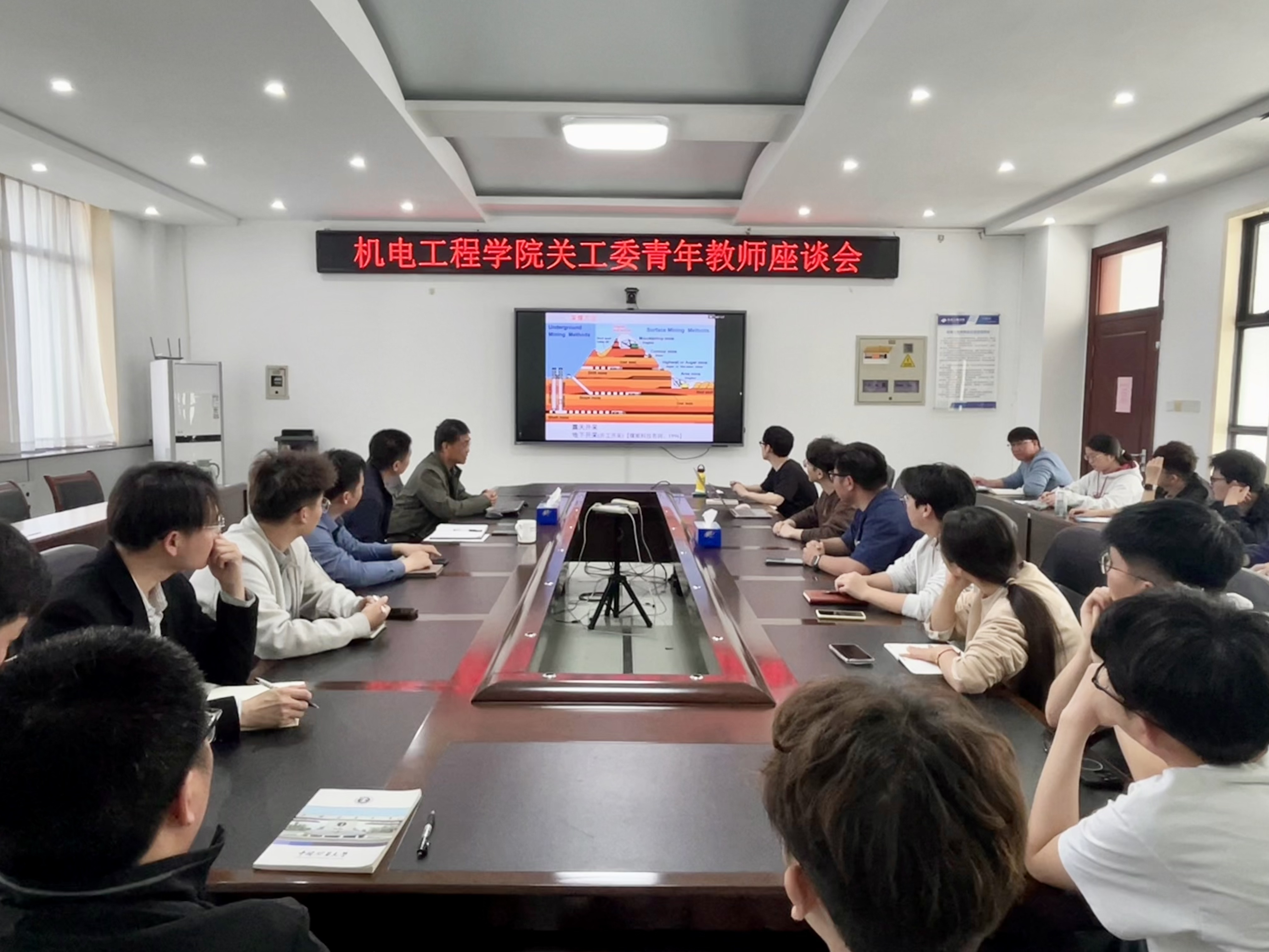 座谈会上,王老师结合自身教学、科研和成长经验,对青年教师展开悉心指导。王启广老师在交流指导中结合煤矿机械主题分享了教学与实践经验。他强调,在讲授机械专业课程时,应紧密联系采煤工艺。随后,王老师围绕采煤方法与矿山机械等核心知识,依托自身丰富的实地调研经历,通过大量真实工作案例,作了深入细致的讲解。他勉励青年教师,要将课程教材与行业标准、前沿技术及现场实践有机融合,持续扎实提升专业素养与教学能力。