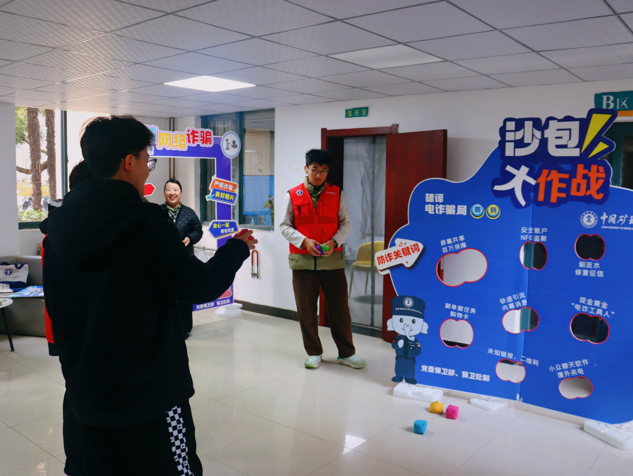 活动现场设置了“反诈科普”与“趣味互动”两大核心区域,内容丰富、形式新颖。在“反诈科普”区,图文并茂的宣传展板直观呈现了刷单返利、冒充客服、虚假贷款等高发电信诈骗类型,志愿者结合真实案例,细致讲解诈骗分子的惯用手段与识别技巧。现场还同步开展小程序反诈知识测试,帮助同学们查漏补缺,系统性构建反诈知识体系。“趣味互动”区更是热闹非凡,“玩套圈,防圈套”游戏中,同学们瞄准写有诈骗场景的目标道具精准投掷,在趣味比拼中强化对诈骗陷阱的辨别能力;“反诈沙包大作战”则让大家通过投掷沙包“击中”反诈知识点,答对即可领取文创奖品。两项游戏将反诈知识巧妙融入其中,让同学们在欢声笑语中加深记忆,现场参与热情高涨。