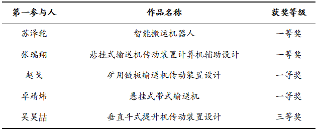 我院苏泽乾团队(成员:苏泽乾、陈曾杰、周港、丁钰明)依托《机械原理》课程项目制实践作品(项目名:智能搬运机器人)获得“整机机构类—设计分析类赛道”一等奖。我院张瑞翔同学、赵戈同学和卓靖炜同学依托机械设计课程设计实践作品获“传动机构类—设计分析类赛道”一等奖,吴昊喆同学获该赛道三等奖。