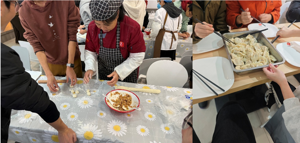 活动前期,学院通过多个渠道完成宣传动员,高效完成报名统计工作。同时,提前与食堂负责人协调筹备好馅料、工具等物资,并做好场地规划与人员部署。活动现场,参与同学有序签到分组后,在食堂工作人员的简单培训下开展饺子制作,大家分工协作、发挥创意,现场氛围热烈欢快;饺子煮制完成后,同学们共同品尝劳动成果、分享节日感受,还合影定格温馨瞬间,工作人员全程做好现场保障与秩序维护,确保活动顺利推进。